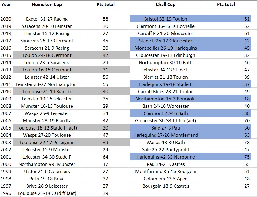 Analysis of historical stats show that the European Rugby Challenge Cup produces higher scoring finals than the Heineken Champions Cup.
