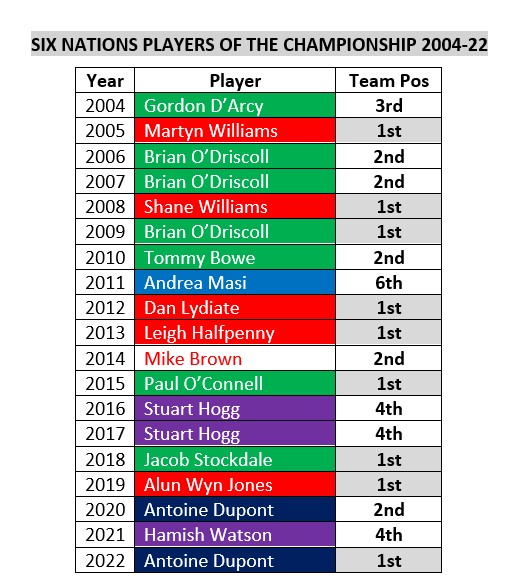 Centre is the position with most Player of the Championship awards but the data is skewed a bit by the fact as three of those were claimed by O’Driscoll.
